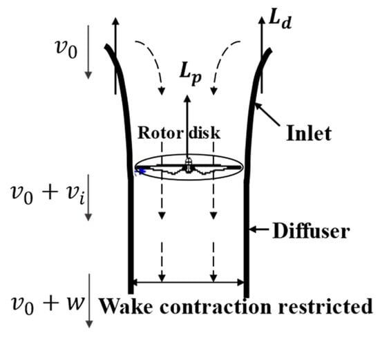 Schematic diagram of the ducted-propeller aerodynamic principle. Rotor disk and downwash in hovering state: Lift force generated by propeller (), , induced velocity (, and far wake velocity (, additional lift force generated by duct ().