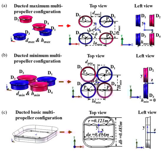Definitions of various configurations of the ducted multi-propeller model. (a) Ducted maximum multi-propeller configuration with ≈ 0.185 m, = 0.24 m, ≈ 0.425 m, ≈ 0.410 m, = 0.59 m at an inclination angle of ≈ 44°. (b) Ducted minimum multi-propeller configuration with ≈ 0.055 m, = 0, ≈ 0.295 m, ≈ 0.285 m, = 0.41 m at an inclination angle of ≈ 44°. (c) Ducted basic multi-propeller configuration with = 0.494 m, = 0.485 m, and = 0.121 m.
