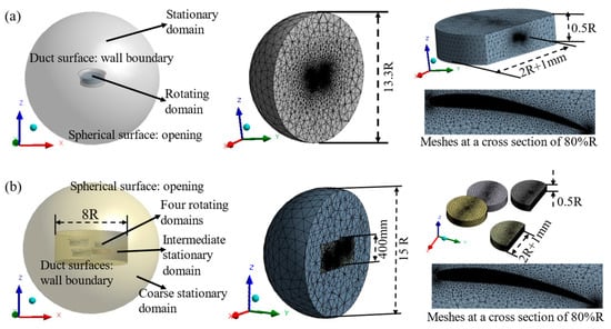 Mesh systems and boundary conditions for CFD simulations. (a) Ducted single-propeller model. (b) Ducted multi-propeller model.