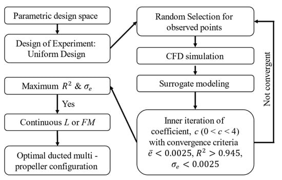 An inner iteration is used to inspect the optimal variables of the coefficient, , varying over a predetermined parametric range (Equation (5)), and a flowchart associated with the optimization based on CFD simulations and the surrogate model is shown in Figure 6.