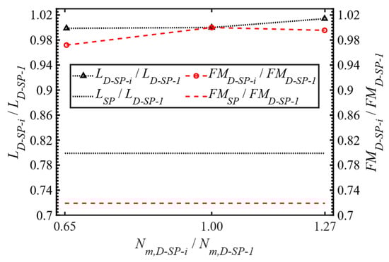 Verification was carried out via self-consistency on mesh independency. The minimum grid spacing adjacent to the wall (propeller) surface, , is controlled by , where , = 0.0162 m (chord length at 75%) [,], resulting in the minimum grid spacing of 0.015 mm. We composed a baseline case of the ducted single-propeller model (D-SP-1), employed the basic duct (Table 1) with approximately 26 million meshes [], and two other cases of 39 million meshes (D-SP-2) and 19 million meshes (D-SP-3), which were compared in terms of computed lift forces and FMs, as shown in Figure 7. A marginal difference in both lift forces and FMs is found among the three cases. Thus, we employed the mesh setting of D-SP-1 in all the other CFD simulations of ducted single-propeller models with the consideration of computer time and numerical accuracy. Besides, the criterion of numerical convergence was set to be that either the maximum residual of pressure is less than or the maximum iteration steps is more than 3000.