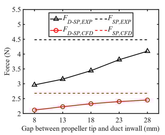 The CFD simulations were further validated via comparison of the lift force generated by the propeller with EXP data [] under the same conditions, in terms of different diameters of the cylindrical shroud surrounding the propeller, from 270 mm to 310 mm with an interval of 10 mm, and a fixed shroud height of 60 mm (with the propeller having a radius of 127 mm and a rotational velocity of 5000 rpm). As shown in Figure 8, the CFD results are consistent with EXP results, sharing a similar trend that the propeller-induced lift force increases linearly with an increasing gap, while being lower than that of the non-ducted propeller accompanying a notable difference, which is caused by the different propeller morphology in the models of CFDs and EXPs. Moreover, it is worth noting that a propeller–duct aerodynamic interaction exists, which may significantly affect the aerodynamic performance of the ducted-propeller associated with lift force production and FM efficiency.
