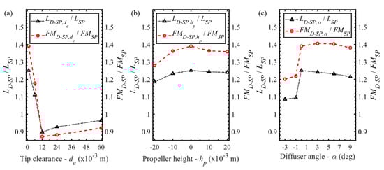 Lift force and FM efficiency vs. (a) tip clearance () ( and ), (b) height difference () ( and ), and (c) diffuser angle () ( and ) in the ducted single-propeller model. and respectively denote the lift force and FM efficiency in the non-ducted single-propeller model.