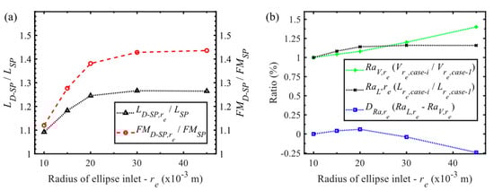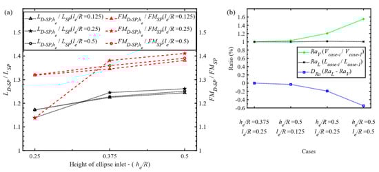 Figure 10a shows the variations of and in various combinations of the dimensionless diffuser length () and dimensionless height of ellipse inlet () while keeping other parameters fixed at = 0.001 m, = 0, = 0, and = 0.02 m. Since the duct volume varies with different combinations of and , we further draw a comparison between the increase rates associated with lift force (: ) and duct volume (: ) in Figure 10b among the four cases of different and that have large values in and as shown in Figure 10a. Obviously, the duct model with and ( = 0.045 m, = 0.03 m) is a high-performance duct design capable of achieving the best aerodynamic performance with a minimal duct weight based on the difference between the increase rates of lift force and duct volume (: ) (Figure 10b). Moreover, the ducted single-propeller model with an ellipse inlet height of = 0.045 m and a diffuser length of = 0.03 m shows a marked improvement on aerodynamic performance with an increase rate of 24.5% in and 38.1% in compared to and . With respect to the effect on aerodynamic performance ( and ) (Figure 11a), while a monotonic increase is observed with increasing with other parameters fixed at = 0.001 m, = 0, = 0, = 0.045 m, and = 0.03 m, it also results in the increase of duct volume based on the () (Figure 11b). Thus, with consideration of the factors of both lift force and duct weight, we propose that the duct model with = 0.02 m can be a high-performance duct design, which noticeably leads to the peak of (, ).