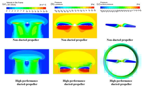 Comparison of flow structures and pressure distributions between the non-ducted and high-performance ducted single propeller model. (a) Iso-speed contours and (b) pressure contours at the cross-section of = 0 m, and (c) pressure contours at the suction side.