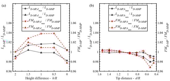 The effect of ducted multi-propeller configurations was investigated by analyzing the aerodynamic performance associated with lift force () and FM efficiency () through adjusting the height difference and tip distance. The height-difference effect was examined as illustrated in Figure 13a through decreasing the dimensionless height difference () with the tip distance fixed. The obviously displays some optimal peaks with an increase rate of 1.7% at = 0.5 with a fixed tip distance at , and 0.4% at = 1.5 with a fixed tip distance at , compared to that in the ducted maximum multi-propeller configuration, resulting in the increase rates of 3.9% and 1.7% in at the same points, respectively. This indicates that the and can be improved at within a range of 0.5 to 1.5 with the tip distance fixed, particularly when the tip distance is fixed at a larger value. This is probably because the aerodynamic interactions between the lower and upper ducted propellers can enhance the lift force production owing to the increase in induced velocity in the ducted propellers positioned lower when varies from 0.5 to 1.5. On the other hand, the tip-distance effect of ducted multi-propeller configurations seems to be small at various dimensionless tip distances () with the height difference fixed (Figure 13b): The and show a marginal variation. This indicates that the tip-distance-induced aerodynamic interaction merely has effect in impairing aerodynamic performance within a narrow range of from 0.82 to 0.46 but is negligible over a range of from 1.54 to 0.82.