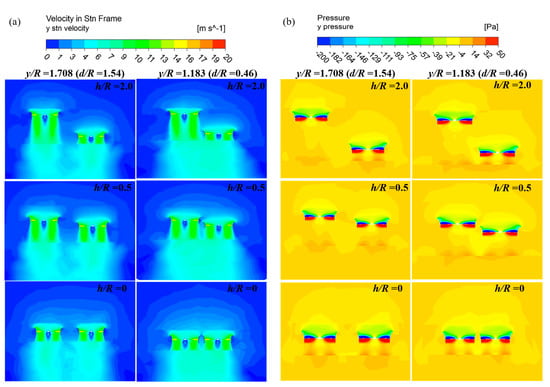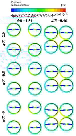 These results are supported by the visualized flow structures of different ducted multi-propeller configurations at cross-sections of = 1.708 ( = 0.205 m) and 1.183 ( = 0.142 m), the planes in which the centers of propellers P1 and P2 are located as illustrated in Figure 14, as well as the pressure distributions of different ducted multi-propeller configurations on the suction side as shown in Figure 15. The interaction between the upper and lower positioned ducted-propellers at the appropriate height difference is effective and enables one to improve the induced velocity of lower propellers ( = 0.5 in Figure 14a) as well as the pressure gradient on the duct inlet surface ( = 0.5 in Figure 14b and Figure 15) with the tip distance fixed. This is beneficial to improve the lift force production, whereas this interaction weakens at = 0 and 2.0 due to the lack of height difference and the too-large distance of the height difference. The interaction among ducted propellers counteracts each other and impairs the downwash-jet because of the interference among them when the tip distance is small with the height difference fixed (Figure 14a), which is harmful to the wake velocity and pressure gradient on propeller and duct surfaces (Figure 14b and Figure 15). Hence, this suppresses the lift force production on the propeller and duct, whereas this interaction is negligible when the tip distance is large because of the downwash-jet separation and interference avoidance owing to the large distance of ducted propellers. In other words, the aerodynamic performance of the ducted multi-propeller can be improved with an appropriate height difference and retained by decreasing the tip distance to a minimal value, which is useful to explore the ducted optimal multi-propeller configuration.