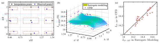 Surrogate model-based results: (a) Interpolation points and observed points, (b,c) comparison of CFD-based results and surrogating model-based results.