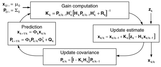 where and denote the approximated a posteriori state and observation, respectively, and the a priori estimate of the previous step. The process is characterized by random noise variables and that represent respectively the process noise and measurement noise, both of which follow the Gaussian distribution with covariance matrices Q and R, respectively. The diagram in Figure 2 summarizes the EKF process loop [37] with associated equations.