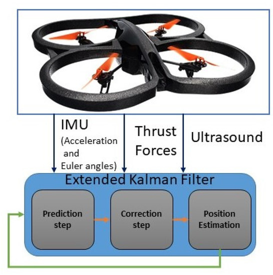 The input commands to the drone system are the PWM signals of the four motors, and the sensor measurements include the three Euler attitude angles, the 3-axis accelerations, and the altitude. The output of the system-identification model is the total thrust force generated by all four motors, (see Equation (18)), which is computed using the accelerometer measurement in the z-axis