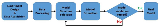 In order to compute accurate motor thrust forces using the PWM signals, we present a system-identification strategy in this section to obtain function in Equation (19) [39]. The system identification process has to go through a few steps to generate that maps the input PWM signals to the total motor thrust [13,14,40,41,42]. The first step is to design flight experiments to collect the data with sufficient accuracy and duration. A good experimental design should ensure that the system is excited adequately by the input commands. The collected measurement data are usually processed by noise filtration and bias removal before being used for deriving high-fidelity models. A model structure is usually selected based on a prior knowledge of the input-output relation for model estimation. After that, the collected data are used to generate and update the selected parameters in the model, such that the model output is matched with the output in the data set. The dataset is usually divided into two subsets, which are used for estimation and validation, respectively. Validating the model and analyzing the uncertainty of the estimated model are the final steps before using the model for the application (e.g., control and state estimation). The estimation-validation process may take several iterations before finding the optimal model with the highest fitting percentage that is used to represent the model accuracy [43]. In this paper, the applied system-identification process [44] is summarized in Figure 4, and was implemented using the System Identification Toolbox in MATLAB®.