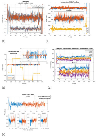 The flight test data were collected using the “rosbags” in the robot operating system (ROS) and imported by MATLAB® for data processing. The data collected from the flight test were re-sampled at 100 Hz, and only the airborne data were selected. The plots between 10 and 140 s in Figure 6 indicate that the drone was in flight. The data are then filtered by a fifth-order Butter-worth low pass filter with a cut-off frequency of 10 Hz. The resulting data are then divided into two subsets for estimation and validation, respectively, as shown in Figure 6e.