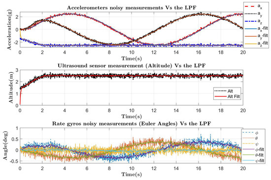 The initial position of the drone is selected as and the drone is controlled to follow a circular orbit of 2.5-m radius with a constant velocity of and a varying altitude. The IMUs and ultrasound sensors are assumed to provide measurements with a frequency of 200 Hz [50]. The measurements of the 3-axis accelerometers and the ultrasound sensor are used to generate the outputs of the EKF in Equation (27). We assume that these measurements are corrupted by the Gaussian noise (for each axis of the accelerometers) and , respectively, where and [31]. Thus, the sensor noise covariance matrix, R, is selected as . The 3-axis gyros measurements are used to compute the transformation matrix, , in Equation (2). We assume that the 3-axis gyros measurements are corrupted by the Gaussian noise (for each axis of the gyros), where . Figure 7 shows the noisy sensor measurements and the ones filtered by LPFs. The noisy measurements were directly used by the EKF and the values obtained by an LPF are used in the self-localization approach presented in [30]. The process noise covariance matrix of the EKF was tuned and selected as Q = diag(, , ). The initial state estimate was chosen to be , while the initial error covariance matrix was chosen to be . As for the LPF, it is based on a cutoff frequency set to 2 rad/s.