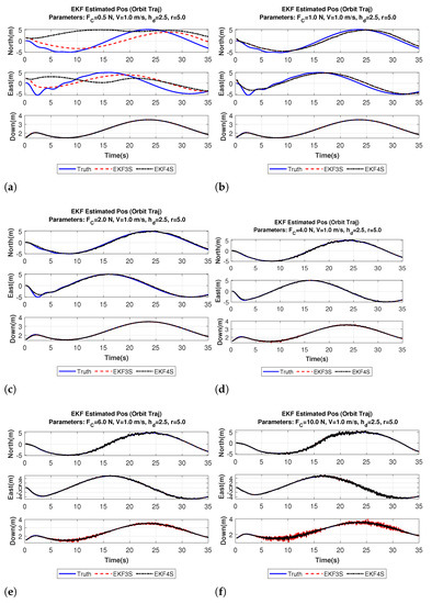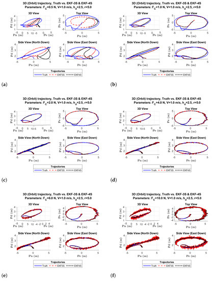 Different views of the ground-truth drone trajectory with a time-varying altitude and the state estimates generated by the 3-state and 4-state EKFs with different cable-tension force magnitudes (): (a) 0.5 N, (b) 1 N, (c) 2 N, (d) 4 N, (e) 6 N, and (f) 10 N.