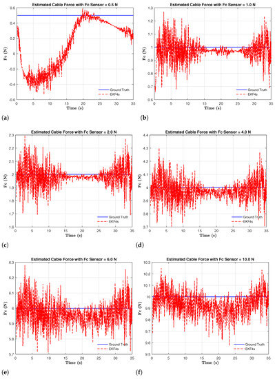 Figure 11 shows the ground-truth cable force (in blue) and its estimates (in red) using the 4-state EKF under different cable forces. Figure 11a shows that the cable-force estimation started to diverge from the beginning and generated impractical negative values and came back towards the ground truth after 20 s and diverged again after 25 s. This observation matches the position estimates in Figure 8, Figure 9 and Figure 10. The cable-force estimates for other cases are consistently accurate within a N range.