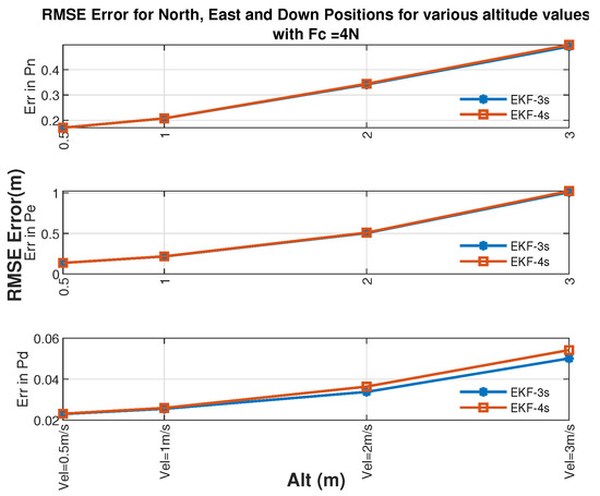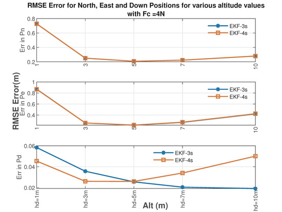 To study the impact of various drone altitudes and velocities on the estimation accuracy, we conducted the simulation with drone altitudes ranging from 1 m to 10 m, and velocities ranging from 0.5 to 3 m/s. Figure 12, Figure 13 and Figure 14 summarizes the RMSE results using different altitudes, velocities, and cable-tension forces. It can be seen from Figure 12 that the 3-states and 4-states EKFs have no significant difference, however, it can seen that at lower altitude of 1 m the error is around [0.7, 0.9] m in North and East position respectively. The error decreases as the altitude increases and it reaches its lowest value at around 5-m altitude. The error increases again as the altitude increases. It can be seen from Figure 13 that the lower the velocity, the lower the postion estimation error in all directions.