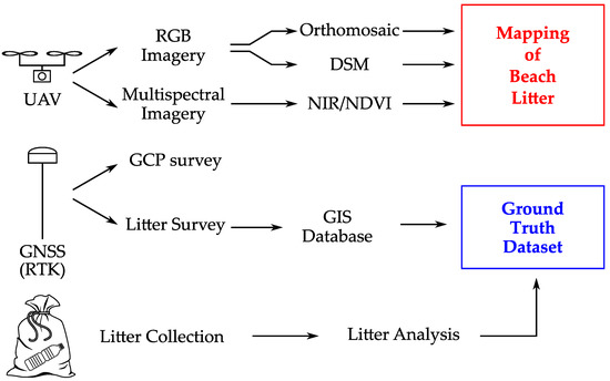 In this section, we present the methodology from the in situ data collection to the mapping and classification of the marine litter based on UAV-derived data. Figure 1 summarizes the overall set of information acquired and processed to obtain (i) the mapping of AMD and (ii) a ground truth dataset.