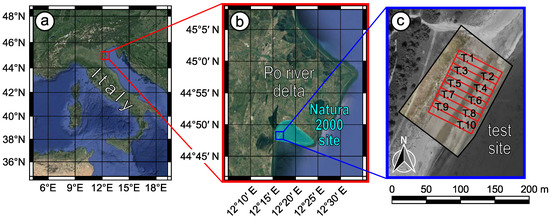 Location of the test site: (a) Po river delta in Northern Italy; (b) zone of the Natura 2000 site of Sacca di Goro—Foce del Po di Volano; (c) the test site divided into transects. (background images from Google Earth).
