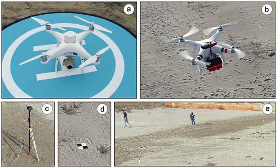 The acquisition of UAV image datasets has been performed using a DJI Phantom 4 RTK (DJI–P4RTK, Figure 3a) and a DJI Phantom 3 Professional (DJI–P3P, Figure 3b). Both UAVs were provided with their own RGB camera (20 Megapixel for DJI–P4RTK and 12 Megapixel for DJI–P3P). The DJI–P3P was also equipped with a Micasense RedEdge M multispectral camera (1.2 Megapixel) able to acquire data in the blue, green, red, red edge, and near infrared (NIR) wavelengths. The main differences between the aircrafts were (i) that the app used for the mission planning of DJI–P3P (Pix4D Capture) allowed us to fly at a minimum altitude of 10 m above ground level, whereas the DJI–P4RTK app integrated into the remote controller (GS RTK) had the limitation of a minimum altitude of 25 m, and (ii) that the DJI–P4RTK was used to acquire image datasets with a centimeter-level georeferencing accuracy due to an on-board multi-frequency, multi-constellation GNSS receiver in RTK mode. A base receiver (DJI Mobile Station 2, Figure 3c) was set up on a benchmark whose coordinates were surveyed using a Topcon GR-3 geodetic receiver in Network-RTK (NRTK). Alternatively, an approach based on NRTK can also be used for drone navigation. Ground control points (GCPs) were deployed using targets prior to image acquisition and surveyed in NRTK mode (Figure 3d) in order to achieve a centimeter-level accuracy for DJI–P3P image datasets as well. Each GCP position was collected through a 30 s stop-and-go method. In this way, data collection was framed in the official Italian reference system ETRS89–ETRF2000(2008.0). Topcon GR-3 in NRTK mode was also used for the ground survey of beach litter (Figure 3e) as reported in Section 2.2.2.