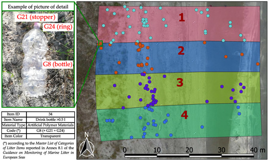 After image acquisition, all the marine litter on the beach was collected for each transect and divided into transect zones (e.g., dune, beach, see Figure 6). All the material was analyzed in the laboratory to identify and classify each item according to the Master List of Categories of Litter Items reported in Annex 8.1 of the Guidance on Monitoring of Marine Litter in European Seas [29] (see Table 4).