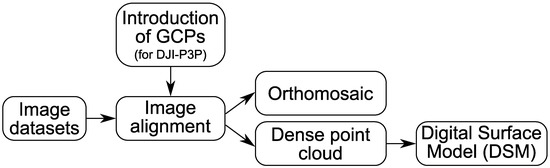 UAV image datasets were used to reconstruct a photogrammetric model of the beach. For this task, we used Agisoft Metashape to generate the orthomosaic of test site transects. Accurate georeferencing was obtained using RTK camera locations for DJI–P4RTK drone or with a set of well-distributed ground control points (GCPs) for the non-RTK drone DJI–P3P during image alignment. The workflow of data processing from acquired image datasets to orthomosaics and the digital surface model (DSMs) is summarized in Figure 5. In particular, we generated RGB and near-infrared (NIR) orthomosaics and the NDVI map. Images with the smallest GSD—thus, for the configuration when flying at a 10 m altitude with the DJI–P3P aircraft—were also used to reconstruct a DSM of the beach. In fact, the elevation variation across the beach profile can provide additional information useful for classifying the litter properly. Visualizing the DSM with hillshade rendering or extracting cross-section profiles on the fly in a geographic information system (GIS) environment may allow operators to evaluate the shape of items with more confidence. However, since the generation of a DSM with a poorer spatial resolution on the ground (higher GSDs) allowed one to identify and classify items of large dimension, we decided not to generate DSMs for flights carried out at altitudes higher than 10m. All the georeferenced orthomosaics and DSMs were exported to further proceed with image-based litter detection. Products obtained after image processing are reported in Table 3.
