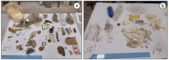 Litter collected in transect T.2 in October 2019: (a) on the beach; (b) in the dune.