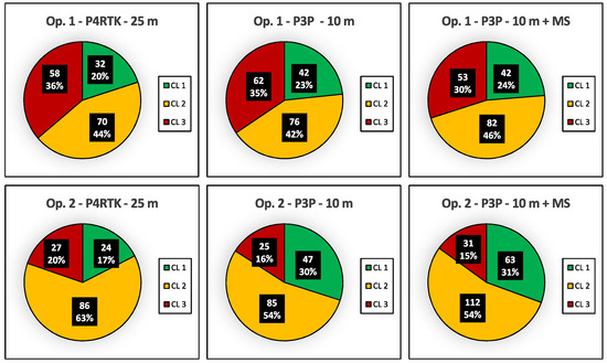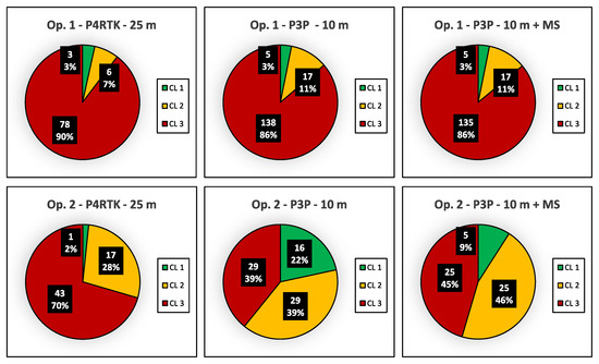 The second beach litter survey results are slightly different from the previous one. Operator 1 assigned a high number of CL 3 (more than 80% of the total), likely due to the lack of experience in distinguishing natural elements on a beach from potential litter items. Operator 2, still maintaining a considerable percentage of CL 3 items, was able to exploit their experience and knowledge of the beach environment morphology to classify the items with higher confidence. In fact, the percentage of items with CL 3 is lower for operator 2 than operator 1: it decreases from 86% to 39% for the dataset acquired with the DJI–P3P at a 10 m altitude (see Figure 10).