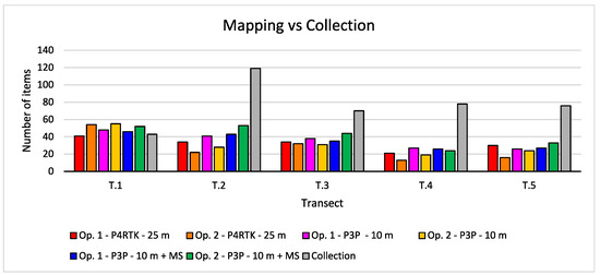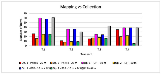 Consistently, litter collection provided the actual number of objects that were present in each transect at the time of the survey. Figure 11 shows the total amount of items recognized by the operators. For most transects, operator 2 found a number of items largely different from operator 1. This is due to the large attribution of CL 3 made by operator 1. Even if the total identified object count is better compared to the collected ones than those identified by operator 2, in many cases, the additional items found by operator 1 were not AMD. Giving operator 1 the option of using UAV pictures in addition to the orthomosaic only, in fact, allowed him to exclude about 70 items that were noted using solely the orthomosaic. UAV pictures provided a view of items from different angles, helping the operator in deciding whether the item was in fact litter. However, under these conditions, the mapping task became more time-consuming.