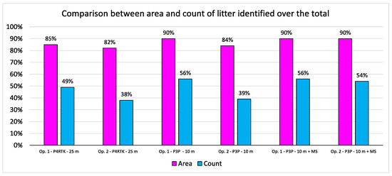 Focusing on the number of items identified does not take into account the size of each object. Here, we show the litter recognized by the operators with respect to the total collected in terms of area. Moreover, we compare this with the simple count of the same objects (2019 dataset, operator 1). Figure 12 shows that accounting for the surface actually covered by each item on the orthomosaics increases the detection of the total AMD up to more than 80% of the total collected. Larger items, in fact, are easier to identify than very small ones and contribute significantly to the overall litter amount, especially if considering them as a potential source of MP.