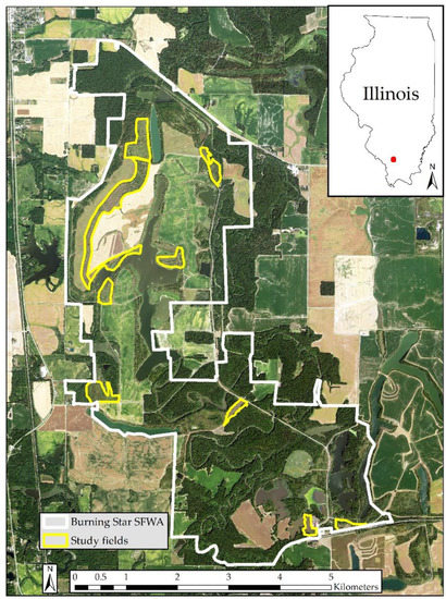 We conducted this study at 10 grassland fields (mean ± SD = 10.99 ± 10.57, range = 1.8–35.9 ha) distributed across Burning Star State Fish and Wildlife Area in northeast Jackson County, Illinois, USA (−89.20315, 37.86606; Figure 1). Burning Star SFWA is a reclaimed coal-mine site with forest, surface water, grassland, agriculture, and shrubland components. Grassland fields were primarily dominated by grasses and forbs with some tree-shrub and wetland components. We used NAIP imagery and orthophotos collected by sUAS for mapping, in conjunction with ground-referenced data points collected for map validation using handheld GPS.
