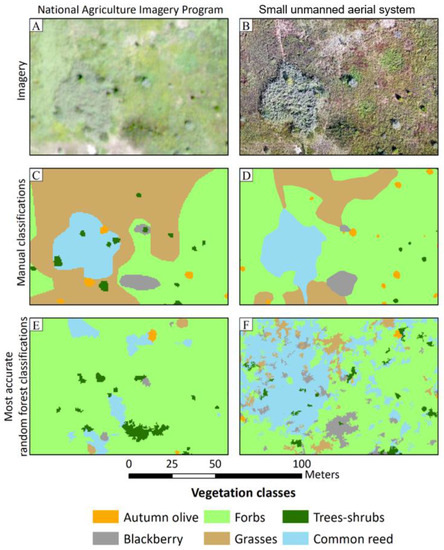 The following supporting information can be downloaded at: https://www.mdpi.com/article/10.3390/drones6110318/s1, Table S1: Accuracy assessment for manual classification of sUAS imagery. Overall accuracy was 89%, Table S2: Accuracy assessment for manual classification of National Agriculture Imagery Program imagery. Overall accuracy was 76%, Table S3: Accuracy assessment for random forest classification of 1.58 cm sUAS imagery with a canopy height model. Overall accuracy was 69%, Table S4: Accuracy assessment for random forest classification of 1.58 cm sUAS imagery without a canopy height model. Overall accuracy was 60%, Table S5: Accuracy assessment for random forest classification of 5 cm sUAS imagery with a canopy height model. Overall accuracy was 63%, Table S6: Accuracy assessment for random forest classification of 5 cm sUAS imagery without a canopy height model. Overall accuracy was 66%, Table S7: Accuracy assessment for random forest classification of 20 cm sUAS imagery with a canopy height model. Overall accuracy was 65%, Table S8: Accuracy assessment for random forest classification of 20 cm sUAS imagery without a canopy height model. Overall accuracy was 61%, Table S9: Accuracy assessment for random forest classification of 60 cm sUAS imagery with a canopy height model. Overall accuracy was 56%, Table S10: Accuracy assessment for random forest classification of 60 cm sUAS imagery without a canopy height model. Overall accuracy was 59%, Table S11: Accuracy assessment for random forest classification of National Agriculture Imagery Program imagery with a canopy height model and segmented using near-infrared, red, and green blue bands. Overall accuracy was 43%, Table S12: Accuracy assessment for random forest classification of National Agriculture Imagery Program imagery without a canopy height model and segmented using near-infrared, red, and green bands. Overall accuracy was 47%, Table S13: Accuracy assessment for random forest classification of National Agriculture Imagery Program imagery with a canopy height model and segmented using red, green, and blue bands. Overall accuracy was 49%, Table S14: Accuracy assessment for random forest classification of National Agriculture Imagery Program imagery without a canopy height model and segmented using red, green, and blue bands. Overall accuracy was 31%.