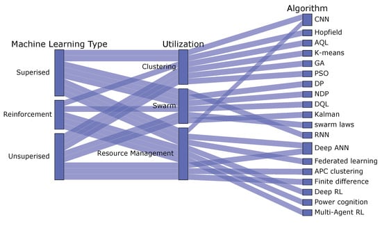 In the literature, numerous networking techniques and routing protocols have been developed and examined to improve networking performance. In order to guarantee the stability and dependability of UAVs, many researchers have already made significant progress in task allocation and cooperative execution. The idea of an avionics cloud based on a UAV swarm was proposed by [], wherein the cloud model for avionics system integration was discussed. Regarding the communication mechanism of an intelligent UAV swarm, UAVs are highly mobile communication nodes that may function as transmitters or relays simultaneously. However, in the presence of interference, UAV swarms require multi-channel access and networking, and the omnidirectional antenna often employed for inter-UAV coordination may degrade spectrum efficiency []. Additionally, the cognitive-radio, broad-spectrum sensing capacity set up the learning process for reinforcement learning and produced better policy sets than conventional Q-Learning []. A real-time reinforcement learning system based on Q-Learning that utilized broadband spectrum sensing and greedy policy to improve real-time policy was presented by []. Additionally, multiple machine-learning types, their utilization and specific algorithms are provided in the alluvial map in Figure 1.