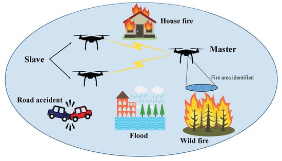 UAV master-and-slave configuration to operate in emergency scenarios such as wild fires, floods and road accidents.