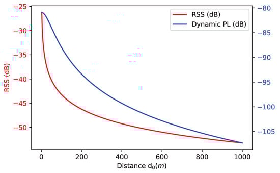 where frequency-dependent path-loss is represented by x and is considered as frequency drift []. One can understand that the aforementioned formula does not take antenna gain into account. During the flight of the swarm, the path-loss is calculated through []. Similarly, the power loss () and vs. are shown in Figure 3.