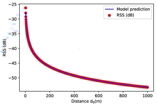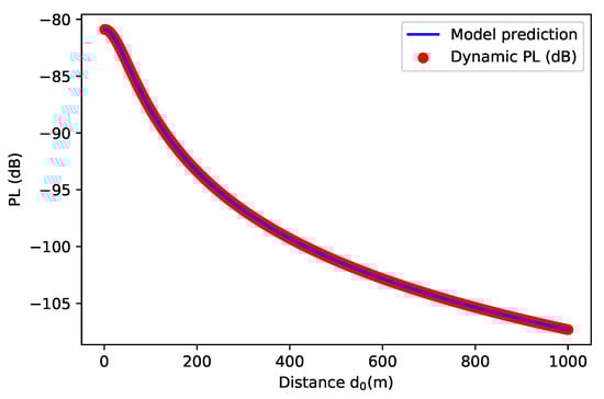 The dataset of path loss and was extracted from Figure 3 []. For this purpose, the plot digitization technique (plot to CSV) was used and preprocessed in Python (Jupyter notebook). Thereafter, the supervised machine-learning algorithm known as random forest (RF) was applied to train the model based on available data points with (n_estimators = 10, random_state = 0). Accordingly, the prediction plots of path loss and has been presented in Figure 4 and Figure 5. As a result, the regression score of RF algorithm is observed around 99%.