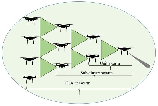 In this section, a mathematical model is formulated for a unit swarm (three UAVs). In order to make the model simple, it is assumed that all the UAVs are flying at the same altitude (2D flying pattern). The mathematical model for a 3D flying pattern is reserved for future work. In the presented unit swarm configuration, the leading UAV is regarded as the master and the two following UAVs are considered as slaves (see Figure 6). Accordingly, the moving parameters of slaves such as speed and direction are dependent on those of the master UAV. In order to avoid a collision, every element of a unit swarm must be at the safe distance. In a master–slave network configuration, there is need of a radar sensor on each element of the unit swarm. In fact, every master UAV of the unit swarm has the ability to communicate with two of its subsequent UAVs, as shown in Figure 7. Consequently, a sub-cluster is formed by joining multiple unit swarms. The expansion of the sub-cluster is the cluster swarm.