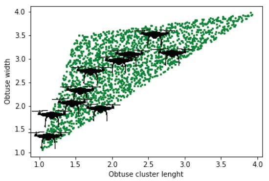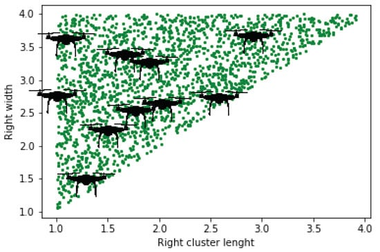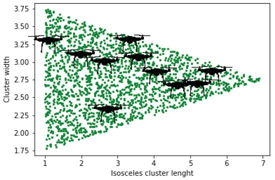 The formation of UAVs with five different techniques based on triangles is discussed. However, the triangular formation is considered the most efficient for aerodynamic applications []. For this purpose, N UAVs were selected ( 10), which were ultimately divided into further sub-clusters and unit swarms. From Figure 8, Figure 9, Figure 10, Figure 11 and Figure 12, the mentioned types of triangular formation have been generated through Python code. According to Figure 8, the green dots represent the allocated space for the UAVs, whereas the random appointment of UAVs was taken for the worst case. The length of the UAV swarm is shown along the x-axis in Figure 8, and width along the y-axis.