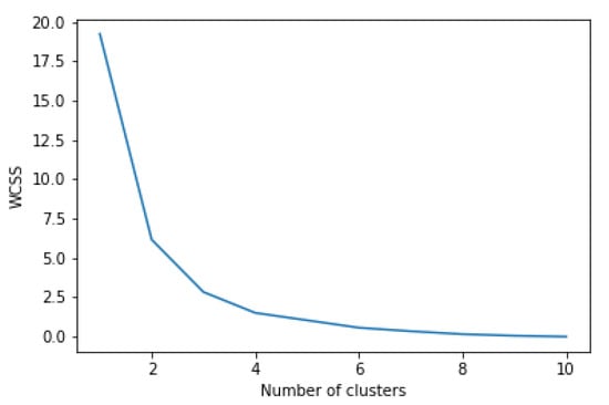 The cluster process of UAVs is divided into three steps. Firstly, the optimum numbers of clusters are found through within-cluster sum of squares (WCSS), as shown in Figure 13. According to the elbow plot, 4 for the given swarm datasets. Secondly, the Euclidean distance of each UAV is depicted with reference to centroids. In Figure 6, the coordinates of and are and , respectively. The equation for euclidean distance can be expressed as below: