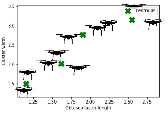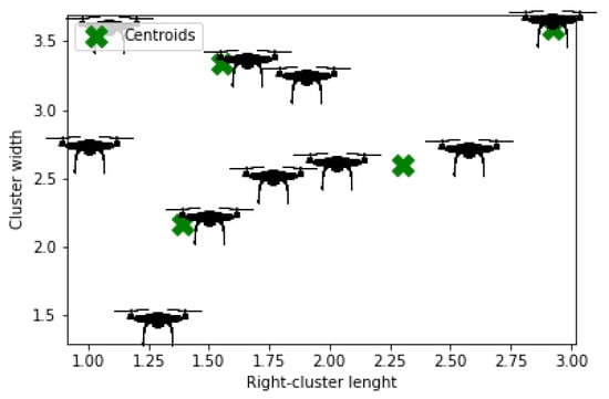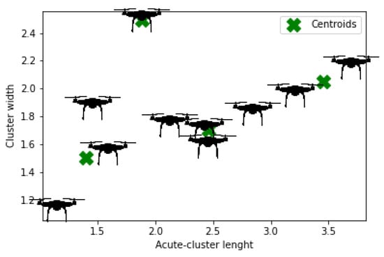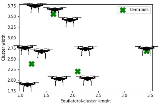 According to the Equation (11), the is set of all UAVs assigned to cluster. Finally, Figure 14, Figure 15, Figure 16, Figure 17 and Figure 18 present the K-means cluster for all proposed types of UAV swarms formation. It has been observed from Figure 15 that one UAV has been marked as a cluster which can be justified the inherent property of outlier in K-means clustering.