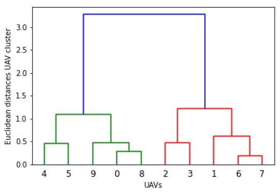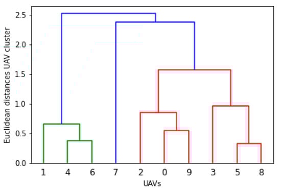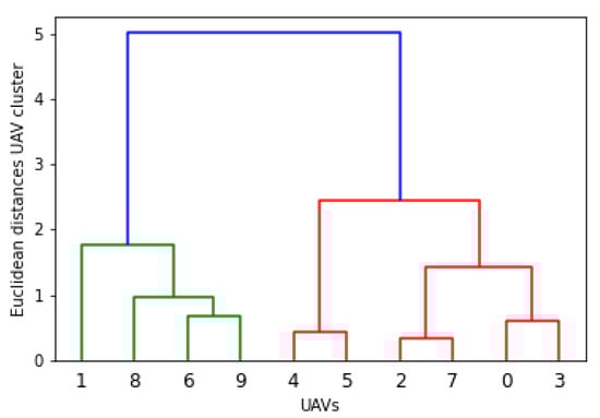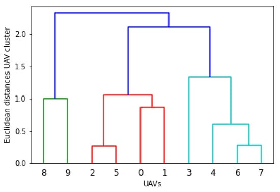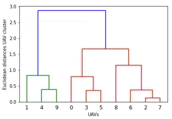 The dendrogram plots are presented for the above-mentioned clusters. In hierarchical clustering, the agglomerative algorithm is used, which has a bottom-to-top approach (unit swarm to cluster). The swarm-ability factor is introduced with the minimum criteria of 0.5 for each unit cluster, and 1 for sub-clusters. Additionally, Figure 19, Figure 20, Figure 21, Figure 22 and Figure 23 present the dendrogram, and Figure 20 is considered the most suitable configuration for swarm formation. On the other hand, 0.5 generates the interference or highlights the other issues related to the physical movement ( and ) of swarm elements.