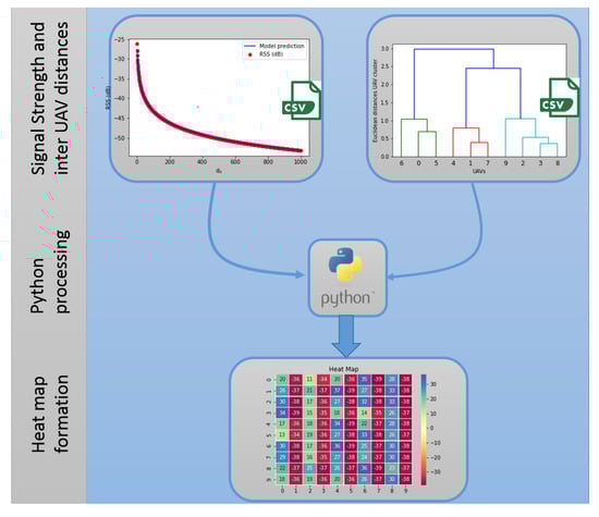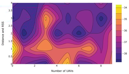 In the path loss profiling and modeling, the predicted and K-means clustering data were visualized. However, the complete procedure is described in Figure 24. Whereas Figure 25 shows the head map with two predictions: UAV clusters and their corresponding . In other words, the heat map can be considered to show the cluster power of parameters (mentioned in Table 1). The odd column shows the predicted , and even columns are UAVs’ clustering distances. The rows in the heat map are the numbers of UAVs; 10. Moreover, it has been observed that the UAVs, on there reallocation, receive power () in the range of −30 to −40 dB. In Figure 26, the contour plot shows the predicted power for the visualization of . Finally, it is shown the whole swarm has a similar range of with normalized clustered distances.