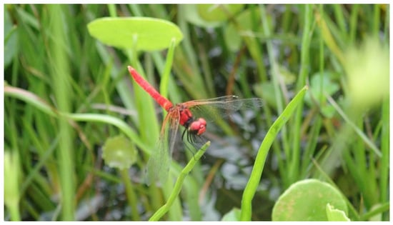 - Ueda, T.; Kinoshita, E.; Ishihara, K. Habitat use by the Tiny Dragonfly, Nannophya pygmaea RAMBUR, and conservation of its habitat in a hillside marsh. Jpn. J. Conserv. Ecol. 2004, 9, 25–36. [Google Scholar] [CrossRef]