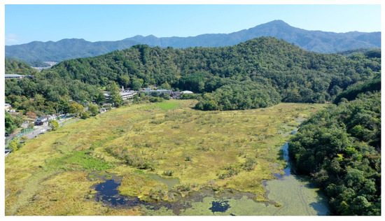 Field surveys in wetlands face several challenges, such as difficulty in accessing the site, hazards during surveys, and risks of disturbing the ecosystem [1]. However, these challenges can be overcome by using unoccupied aerial vehicles (UAVs) for monitoring wetlands [2] and managing and conserving the wetland ecosystem [3]. UAVs can monitor wildlife populations and their habitats and also significantly reduce human access and survey time compared to field surveys [3]. Most of the studies on wetland wildlife that have used UAVs have focused on birds [3]. Using UAVs to monitor smaller organisms, such as wetland-specific plants and insects, can aid in the effective management and conservation of the wetland. In general, the UAVs need to fly at very low altitudes to capture images of organisms as small as a few centimeters. However, flying at such low altitudes increases the risk of UAVs coming into contact with the tall-stemmed grasses and shrubs growing in wetlands, and the downwash and noise generated by the UAV can affect the target organisms. In recent years, smaller UAVs equipped with telephoto lenses have been developed. The telephoto lenses allow UAVs to capture organisms as small as a few centimeters from a much higher altitude without affecting the target organisms.