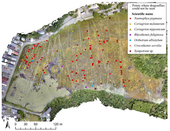 The DJI Mavic 3 camera drone was used for conducting the survey. First, using multiple survey lines that can cover the entire wetland, the drone was flown manually at low speed and at an altitude of 4 m to 5 m over the entire survey area in the wetland. While flying over the survey area, the drone took images every few meters by using its 7× telephoto lens on the Mavic 3 (7× optical and 4× digital). The survey was repeated five times, i.e., on 28 June, 29 July, 3 August, 8 August, and 9 September 2022. Each survey took approximately 50 min. The images captured were 4000 × 3000 pixels, displayed on a full screen of 2560 × 1440 pixels. Most of the images were of legible quality, although there were some out-of-focus images when the drone was not at a complete stop, or when there were shrubs. Each image was viewed for approximately 20–30 s, and if a dragonfly was observed in the image, then its species name was recorded. To verify the accuracy of the identification of N. pygmaea, one additional person was added to the identification. The DJI Mavic 3 is equipped with global navigation satellite system (GNSS), which records the shooting position on the captured images. The geographic information system (GIS) was used to create point data from the XY-coordinates of the shooting position recorded in the images. Accordingly, the distribution data of dragonflies were created by combining the point data with the species name.