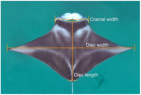 Of these three techniques, underwater visual estimation is the most commonly-used method to record the size of M. alfredi; typically, disc width (DW, defined by Notarbartolo Di Sciara [] as the greatest dimension between the outermost tips of the pectoral fins) is estimated based on the lengths obtained by divers or snorkelers directly above, below, or next to manta rays [,]. Despite the ease and practicality of this approach, visual size estimation can generate significant biases and inconsistencies in size estimates [].