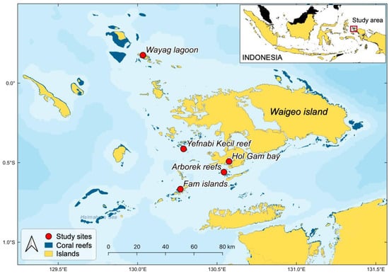 Study sites (red dots) in Northern Raja Ampat archipelago, West Papua, Indonesia.