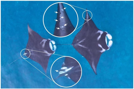 In addition to the morphometric dimensions of M. alfredi, we opportunistically recorded key demographic parameters of the measured individuals, specifically sex and evidence of maturity. The sex of a manta ray is typically determined in ventral view by divers or snorkelers, with the presence of claspers indicating a male and a cloaca indicating a female []. Males are considered mature when their claspers are enlarged and calcified and extend posteriorly beyond the pelvic fins [], a morphological feature that is readily observed from a dorsal view (Figure 4; []). While the cloaca of a female manta ray is not visible in dorsal view, the mating scars on the left-wing, a clear sign of a mature female [], are clearly visible (Figure 4; []). For each animal measured, we recorded whether they were mature using the criteria above. Manta rays with neither visible claspers nor mating scars were recorded as unsexed individuals.