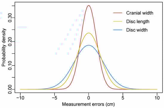 The probability density of drone measurement error showed high accuracy for each dimension, with an estimated standard deviation (SD) of 1.13 cm for CW (95% CI: 1.06–1.21), 1.69 cm for DL (95% CI: 1.58–1.80), and 2.16 cm for DW (95% CI: 2.01–2.30) (Table 1, Figure 5). These estimated standard deviations were very small relative to the estimated means of these dimensions for the total population of manta rays (0.75% as large for DW; 1.30% for DL; and 1.52% for CW).
