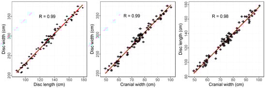 Each pairing of DW, DL, and CW for all individual M. alfredi measured using drones and estimated using our model in this study was strongly linearly correlated, with estimated coefficients of correlation ranging between 0.98 and 0.99 (Table 1, Figure 6). The correlation between DW and DL was the highest of the dimension pairings, with 0.99 (95% CI: 0.982–0.993), although the correlation between DW and CW was nearly identical, at 0.99 (95% CI: 0.980–0.991).
