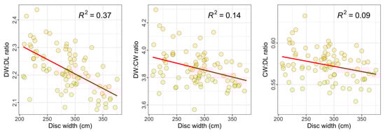 The linear model showed a clear negative correlation between each ratio and DW (Figure 7). DW explained about 37% of the variation in the DW:DL ratio, but it only explained about 14% of the variation in the DW:CW ratio. Taken together, these negative correlations suggest that M. alfredi have a faster rate of growth in the DL dimension than in the DW or CW dimensions, becoming relatively slender as they grow longer. This is commonly described as negative allometric growth []. Moreover, our results suggest that the growth rate of CW is faster than that of DW.